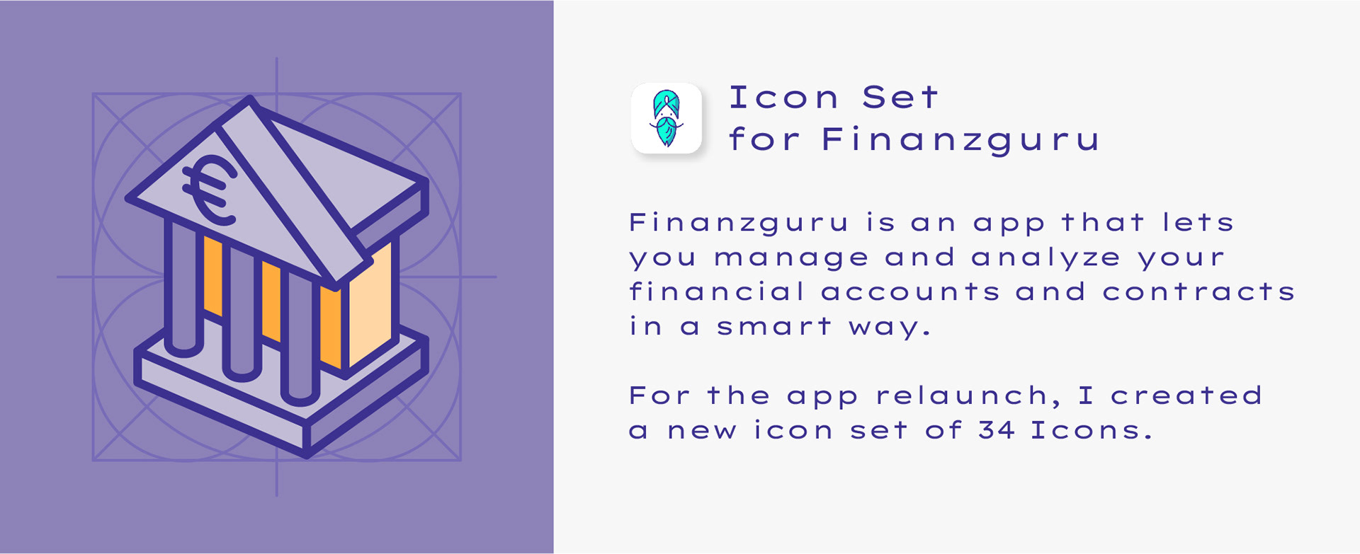 Finanzguru is an app that lets you manage and analyze your financial accounts and contracts in a smart way. For the app relaunch, I created a new icon set of 34 Icons. The icons fit to the Finanzguru branding concept, but are able to stand for themselves and to add a new visual level to the app experience.